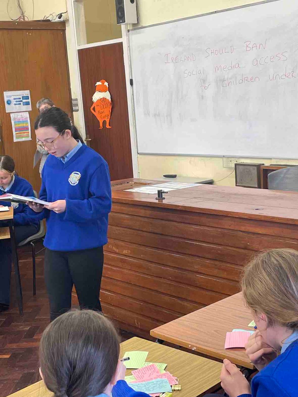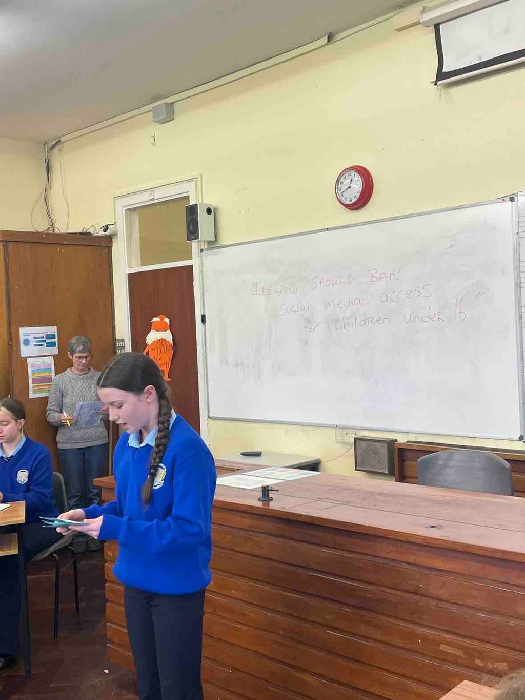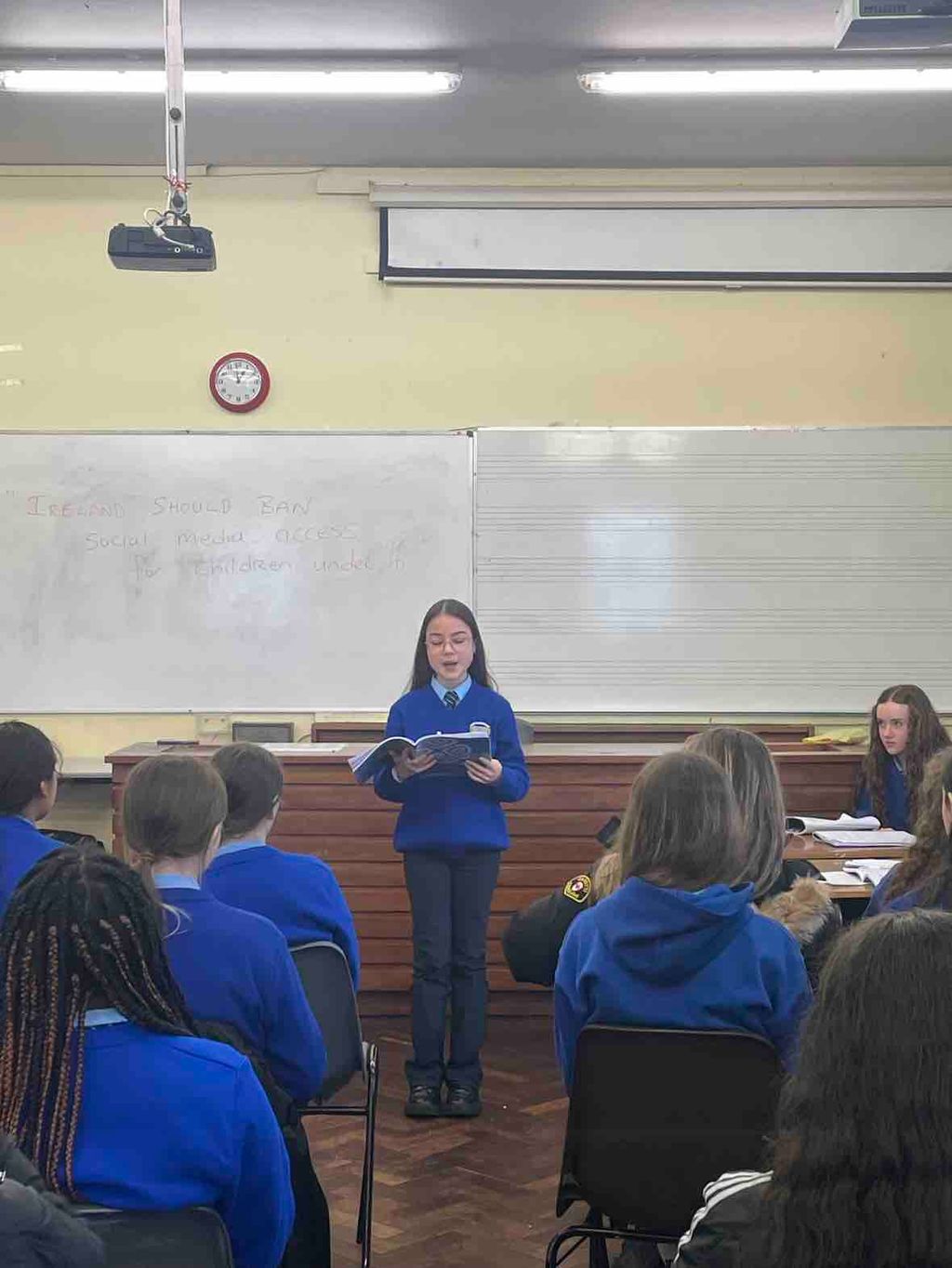 Today the 1st yr English classes held a debate. A team from each class was put forward, having been selected through a first round process. The motion hotly debated today was: Ireland should ban social media access for children under 16. All teams performed well with 1B defeating the motion and 1C carrying the motion. Well done to all those that took part and we look forward to the final round of this competition next term, when 1B will face 1C for the title of 1st yr Debate Team 2026. Thank you to the first yr English teachers for preparing the students and to our adjudicator Ms Keogh.